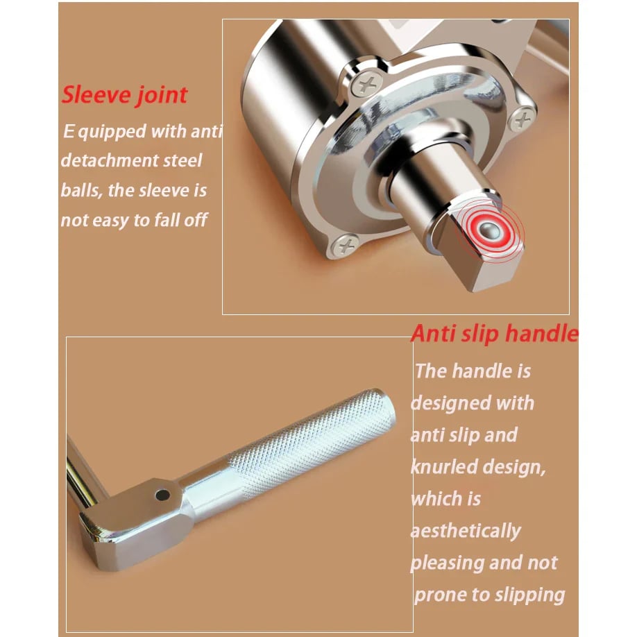 - Fördelar: Förtjockat stål, inte lätt att bryta, arbetsbesparande design, snabb demontering, högkvalitativa lager, flexibel rotation, högt vridmoment, inte lätt att glida, utsökt och kompakt, lätt att bära, med avtagningsskyddade stålkulor, hylsa inte lätt att falla av, handtag med halkskyddad räfflad design, vacker och inte lätt att glida