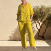 KOMFORTABEL BOMULL OCH LINE BLANDNING - Tillverkad av en förstklassig blandning av bomull och linne, denna tvådelade kostym skapar den perfekta balansen mellan komfort och stil. Tygets naturliga andningsförmåga säkerställer komfort hela dagen, vilket gör den idealisk för avslappnade utflykter eller avkoppling hemma.