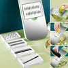 Inkluderar säkerhetsskydd för att skydda fingrar och hålla mat; Halkfria gummifötter säkerställer stabilitet på skärytan; Tack vare skårorna kan grönsaksskäraren fästas över en skål. Handtaget ger stöd och vinkel.