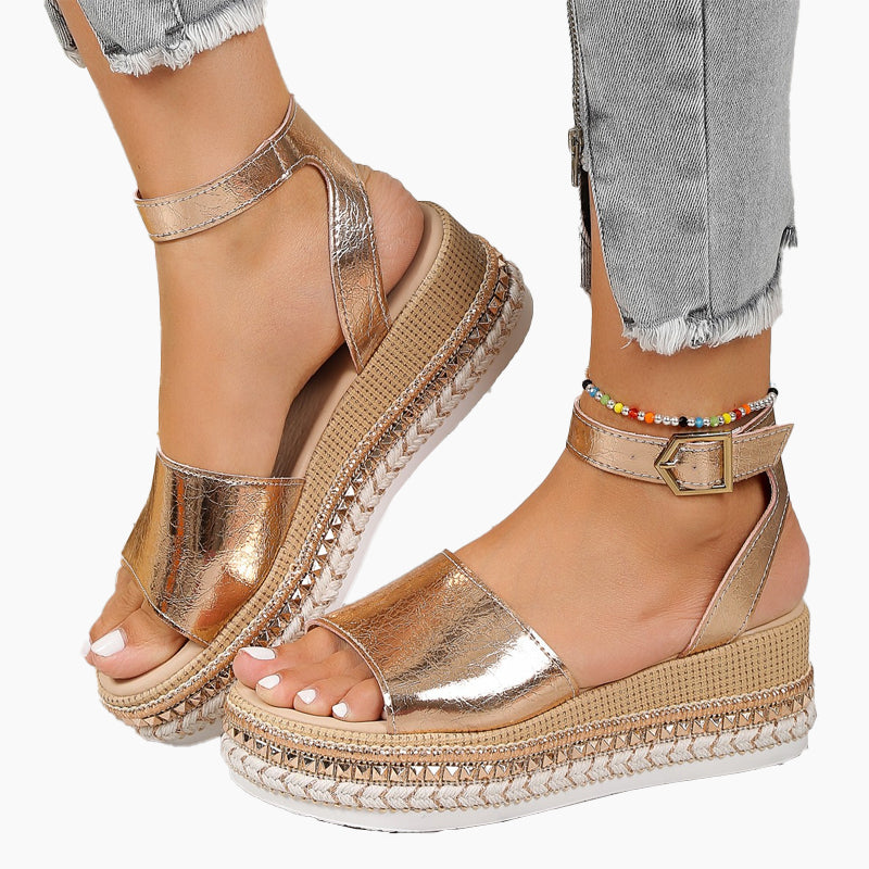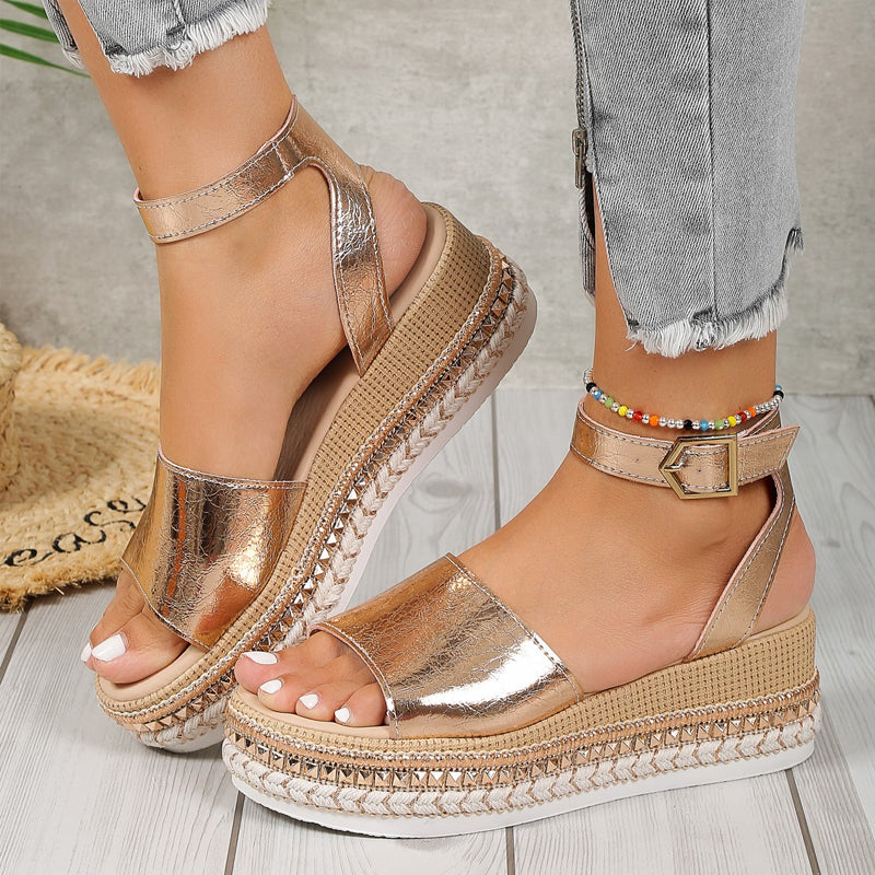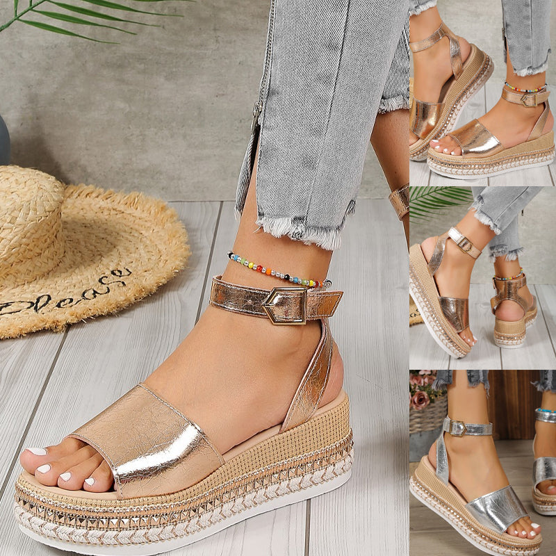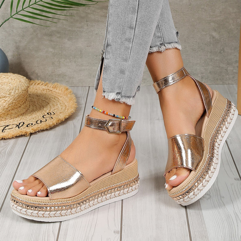 LYXIG METALLISK FINISH- väcker uppmärksamhet med skimrande guld- eller silverfärgad högglansig PU. Fiskmunsdesignen kombinerar avancerad stil med sofistikerad design. Den reptåliga finishen håller sig strålande, dag som natt. Matcha med strandkläder eller cocktailklänningar - lyfter alla outfits på ett enkelt sätt. Gå som huvudpersonen.