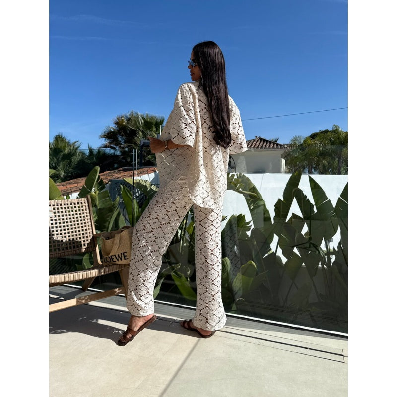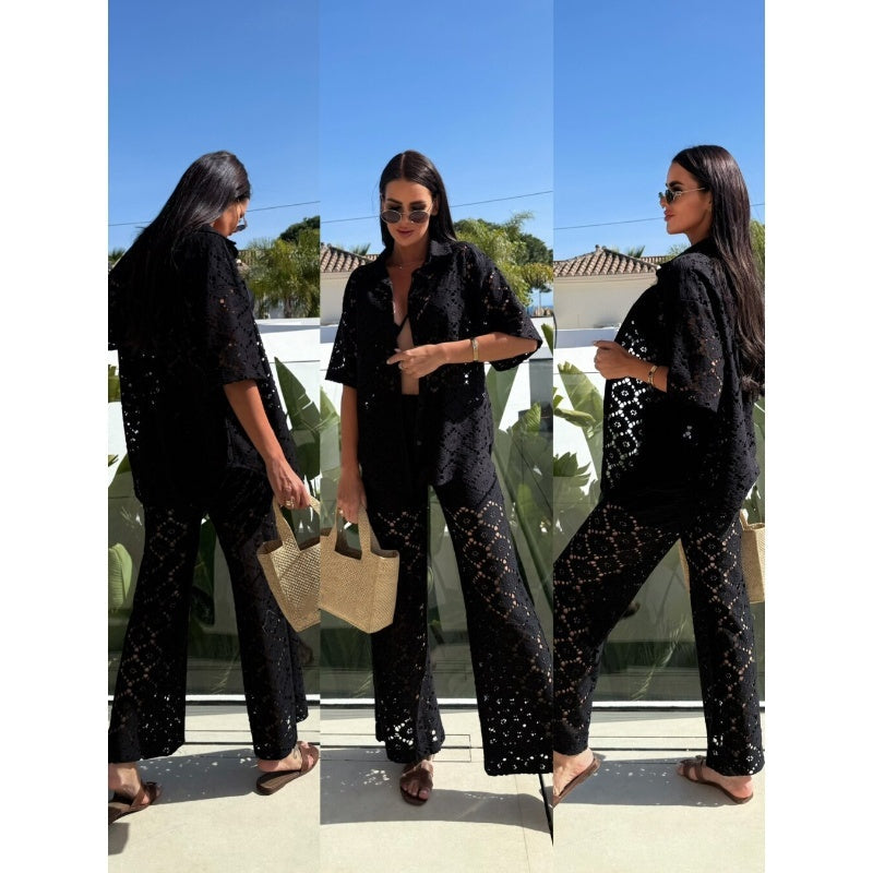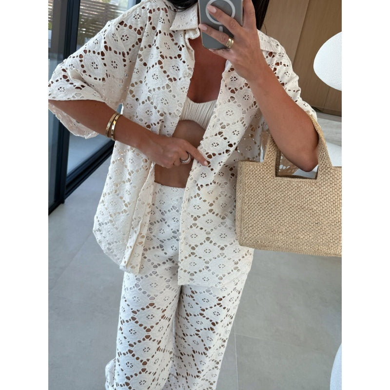 LAPEL SHORT-SLEEVED TOP - ELEVATED CASUAL STYLE: Setet innehåller en snygg kortärmad topp med revers som kombinerar avslappnad lätthet med en raffinerad silhuett. Kragen ger struktur medan den andningsbara passformen ger komfort i varmt väder. Denna topp är perfekt för vardagsbruk och kan kombineras med jeans, kjolar eller matchande byxor för enkel samordning.