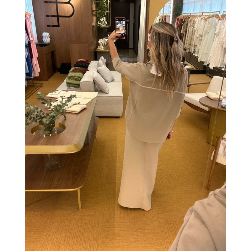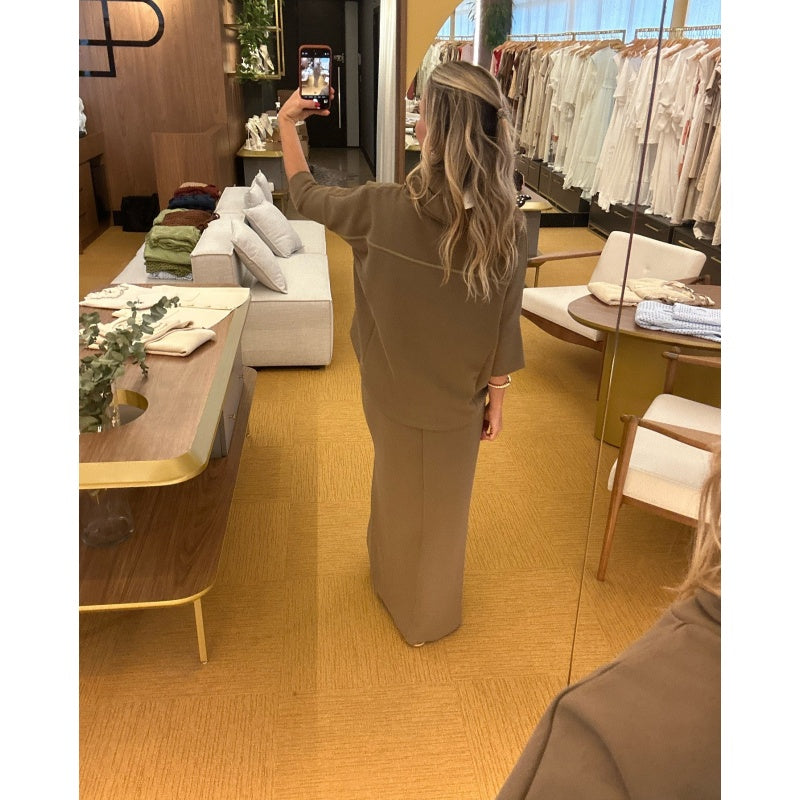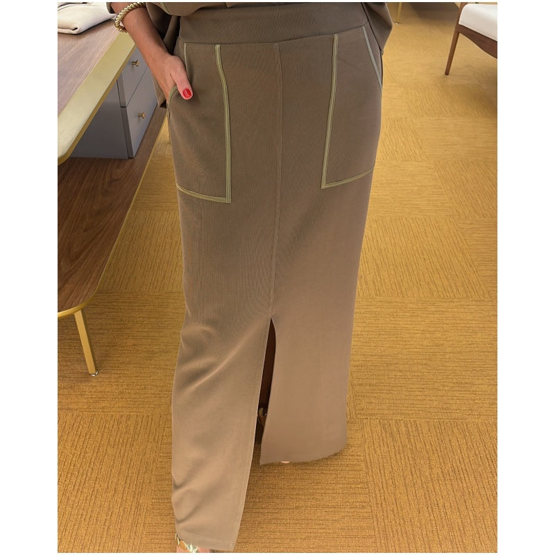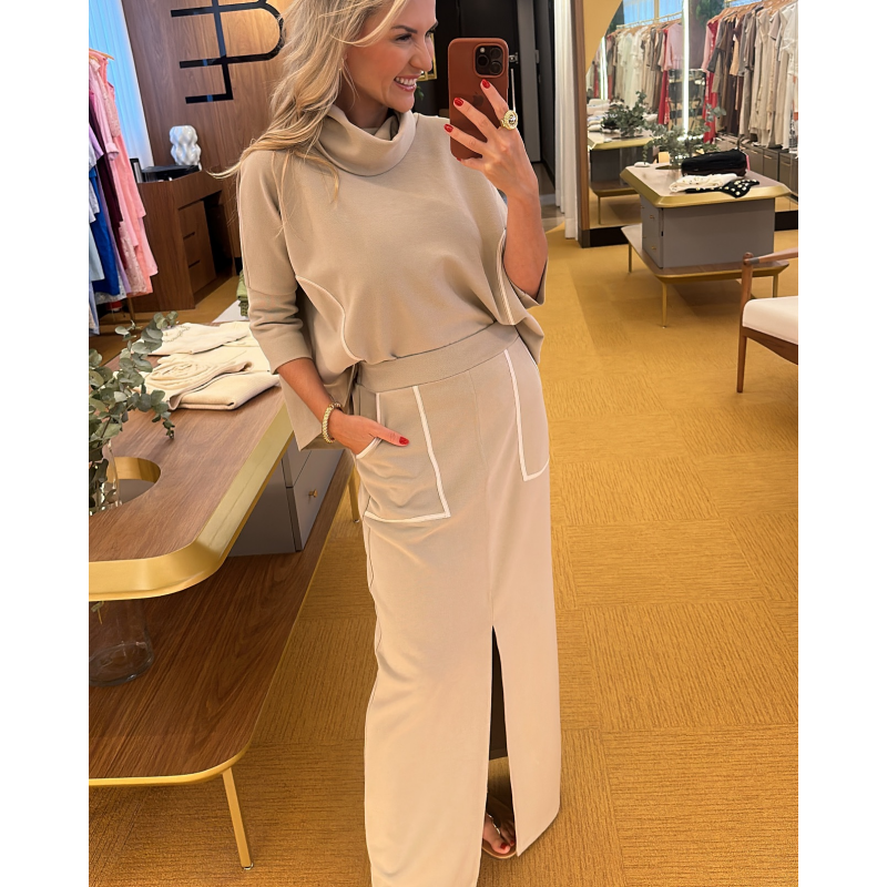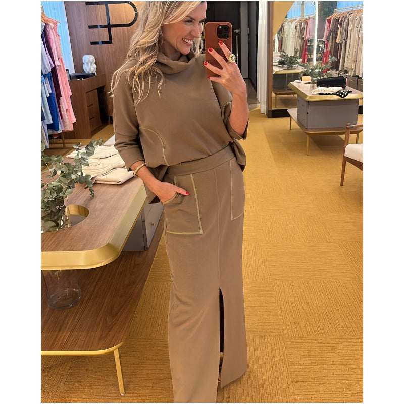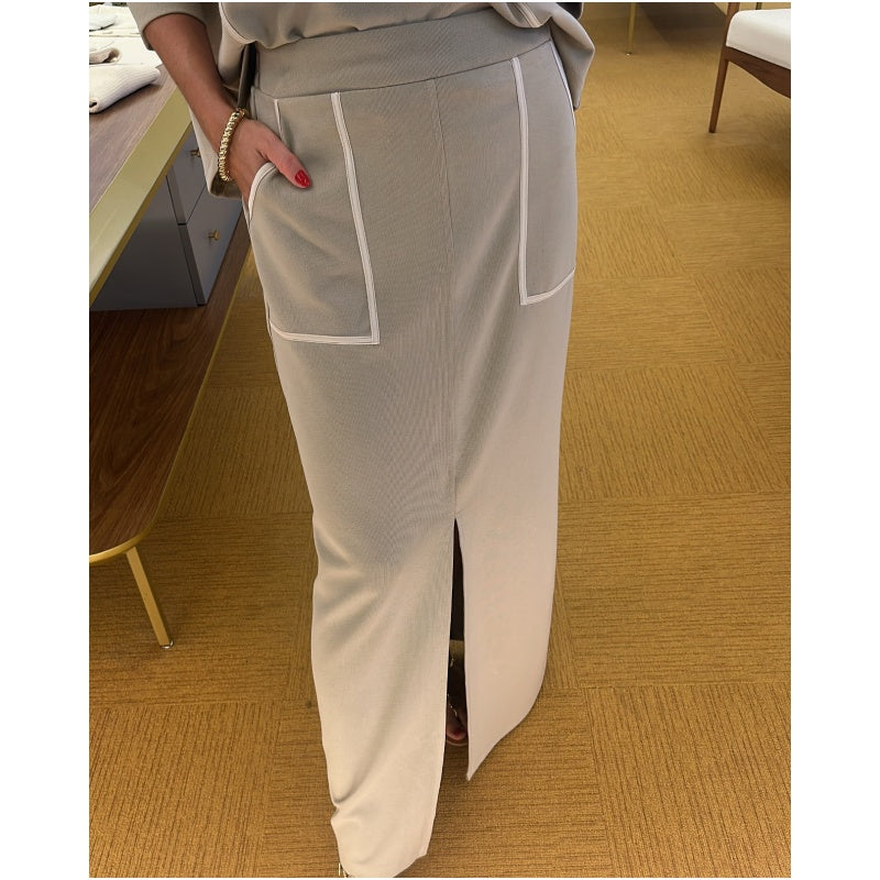 KJOL MED DELAD FÅLL - Ger frihet och en subtil känsla. Kjolen har en smakfullt designad delad fåll som ger ökad rörlighet och en smickrande silhuett. Det ökar rörelsekomforten och ger en dynamisk, feminin touch som kompletterar det minimalistiska temat - perfekt för dem som värdesätter både funktion och känsla i vardagsmodet.
