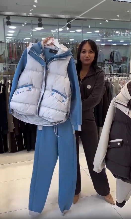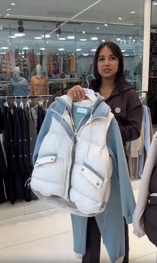 Denna tredelade 、samordnad design som kombinerar olika plagg for att skapa en stilren, lager-på-lager-look。 Huvan ger en avslappnad touch samtidigt som den håller dig varm。
