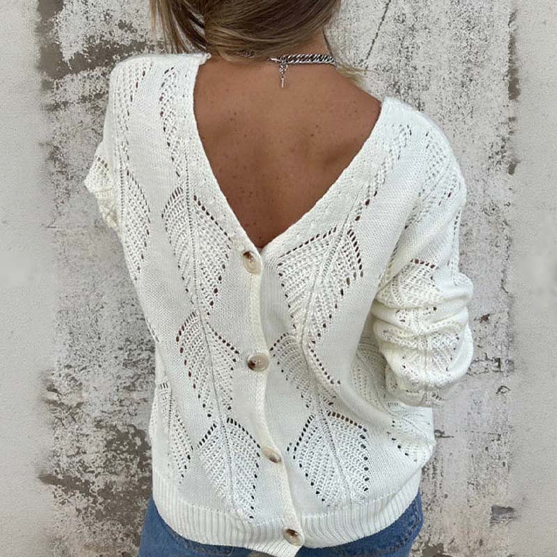 V-HALS MED KNAPPAR - Den smickrande V-halsen kompletteras av en diskret knappdesign som förstärker tröjans eleganta look. Denna kombination ger både en avslappnad charm och en touch av sofistikation, vilket gör den perfekt att kombinera med halsband eller att bära som ett fristående plagg.