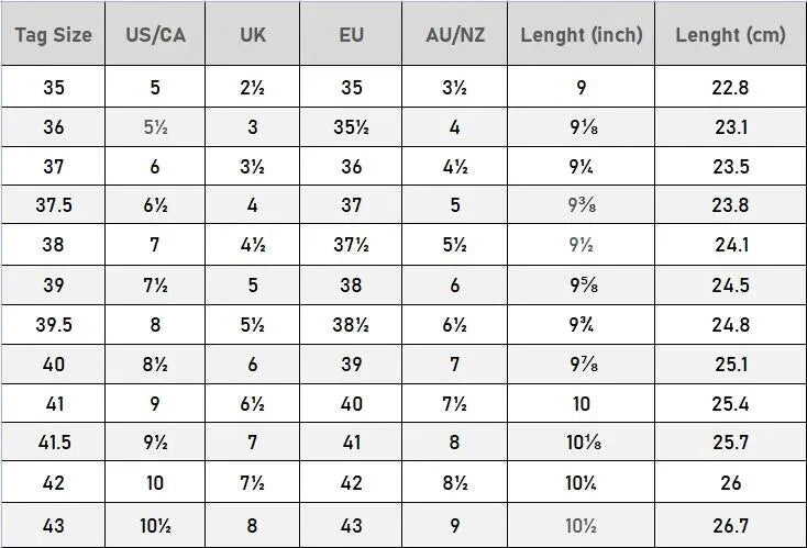 2. När du vet din fotlängd, se storlekstabellen för att avgöra vilken storlek du ska köpa. Storleksnumret för Storbritannien/USA på vissa taggar kan skilja sig från storleksnumret för Storbritannien/USA i vår storlekstabell, vänligen ta vår storlekstabell som standardreferens.