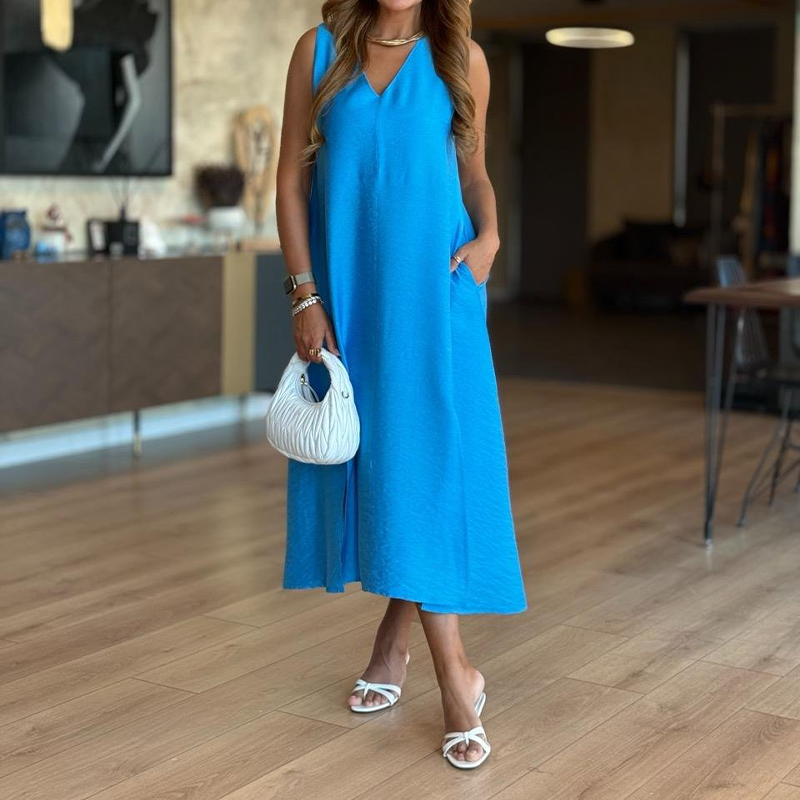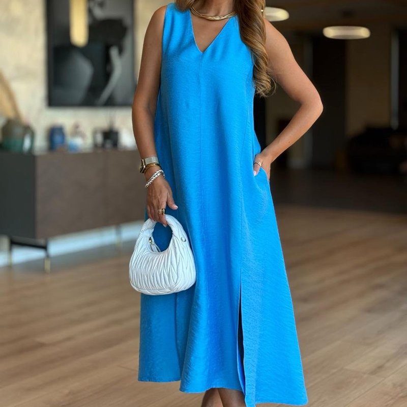 Enfärgad V-hals ärmlös klänning med slits
