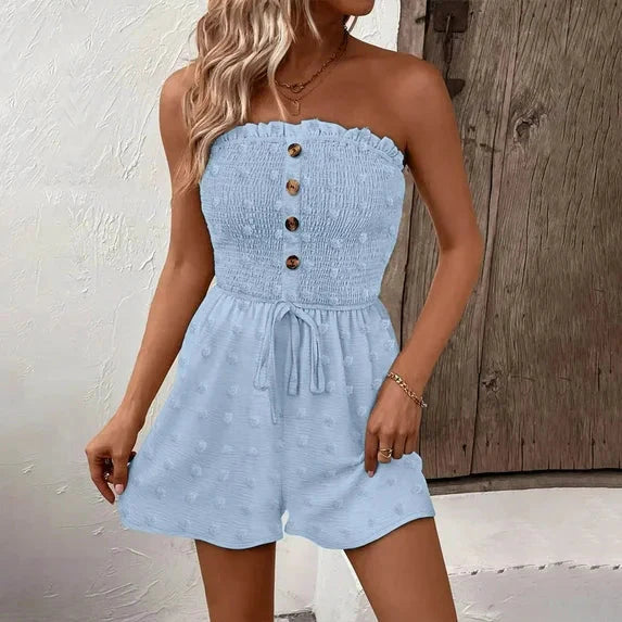 Ta hem den axelbandslösa byxdressen med fejkknappar, volangkant, smockliv, knytning och vida ben redan idag – och förnya din stil med detta mångsidiga nyckelplagg!