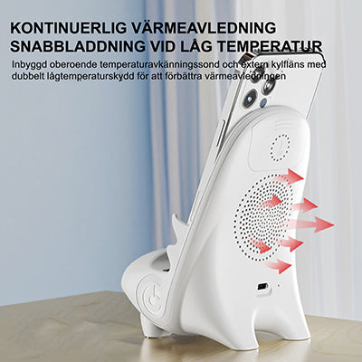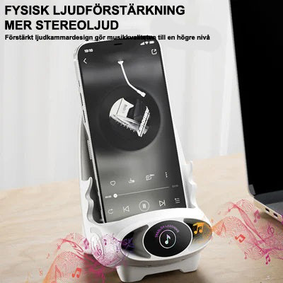 Unik och ny, den trådlösa laddnings-/mobiltelefonhållaren kan placeras horisontellt eller vertikalt, och det finns ett ljudhål i botten för att göra ljudet mer tredimensionellt när telefonen spelar.