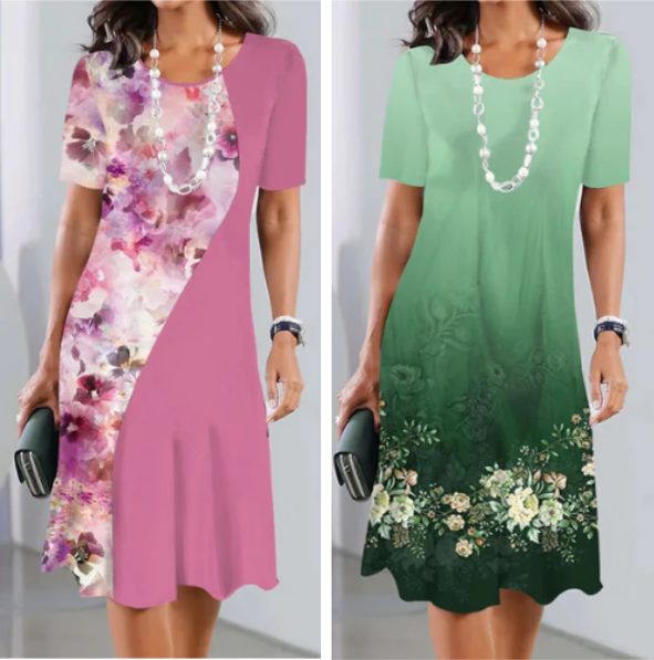 Elegant rundhalsad klänning för kvinnor med blommigt tryck