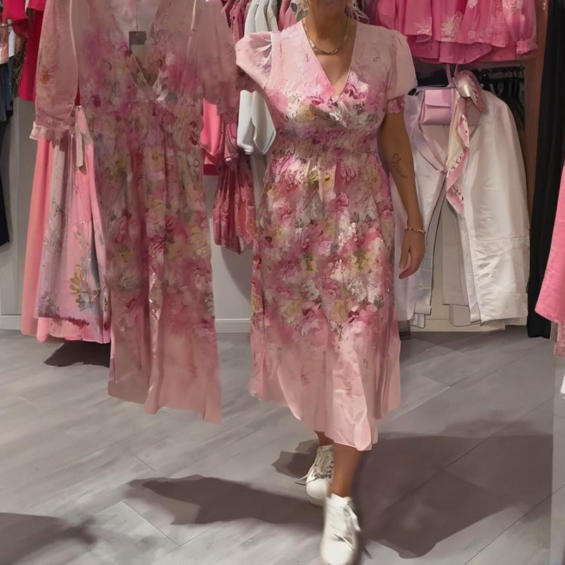 Elegant lång klänning med blommönster och V-ringning för kvinnor