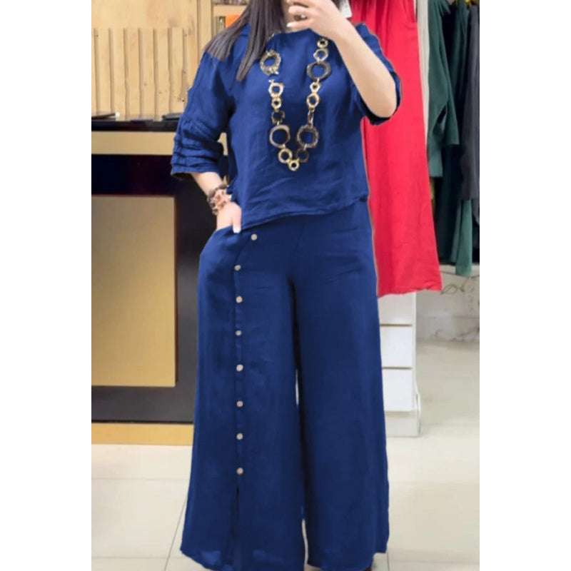 Enfärgad casual 3/4 ärmad topp med lösa knappbyxor för kvinnor 2-delat set
